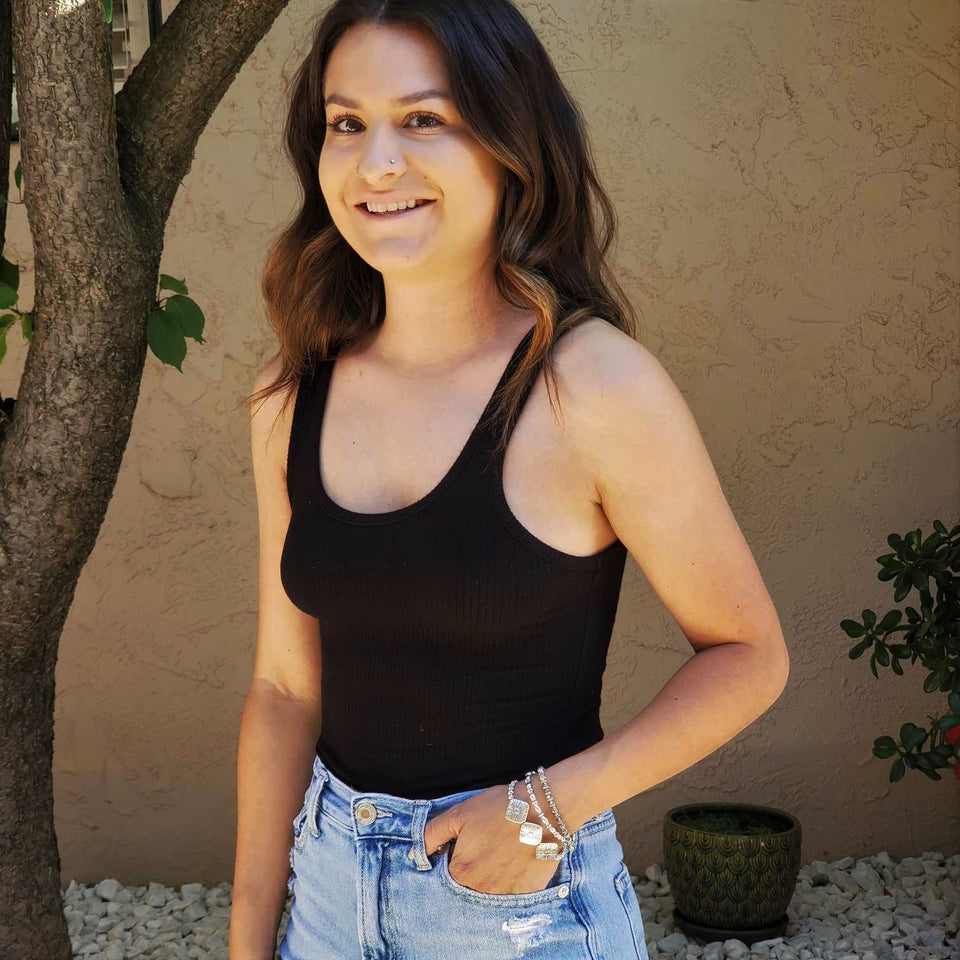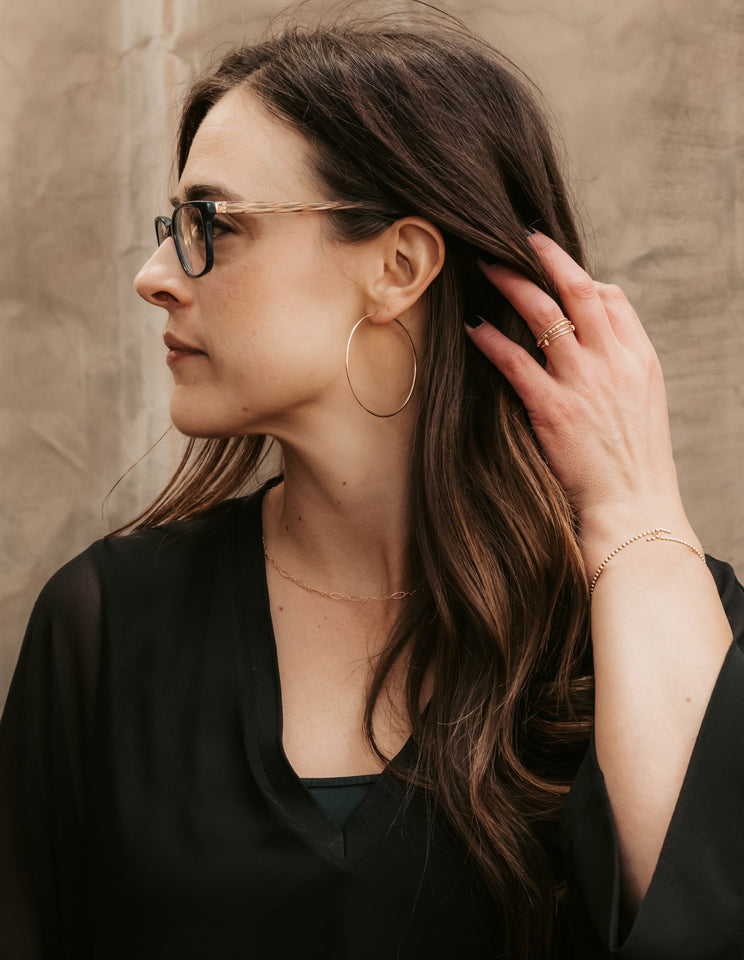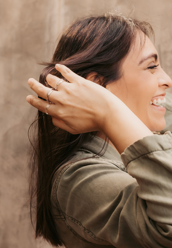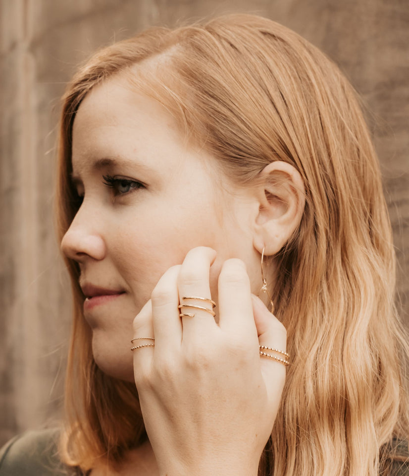 Ashley is wearing Uniquely Ivy's handcrafted gold rings on her thumb and middle finger and two handpicked gold rings on her pinky.