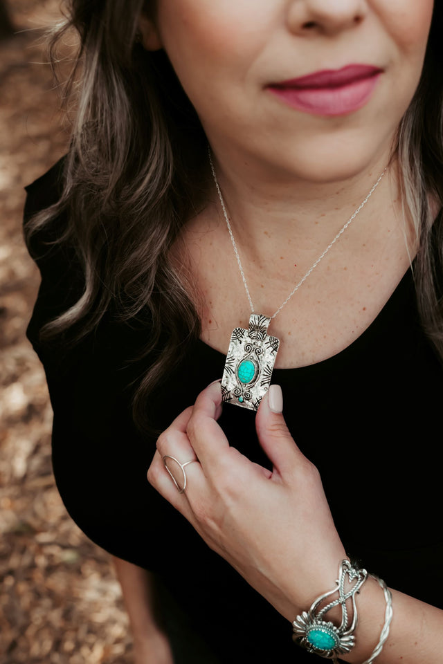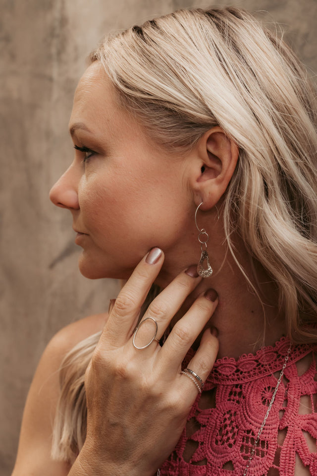Jenell is wearing Uniquely Ivy's handcrafted earrings and necklace, along with three handpicked rings on her fingers