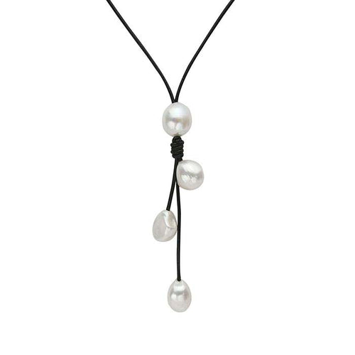 32" Y-Style Black Leather Necklace with White Freshwater Cultured Pearls